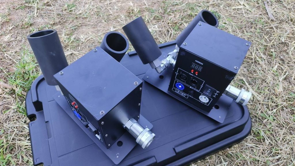 เครื่องยิง Co2 Effect แบบตัว V ต่อ 1 จุด สั้งงานด้วยระบบ DMX ยิงได้สูงสุด 3 นาที ต่อ 1 ถัง